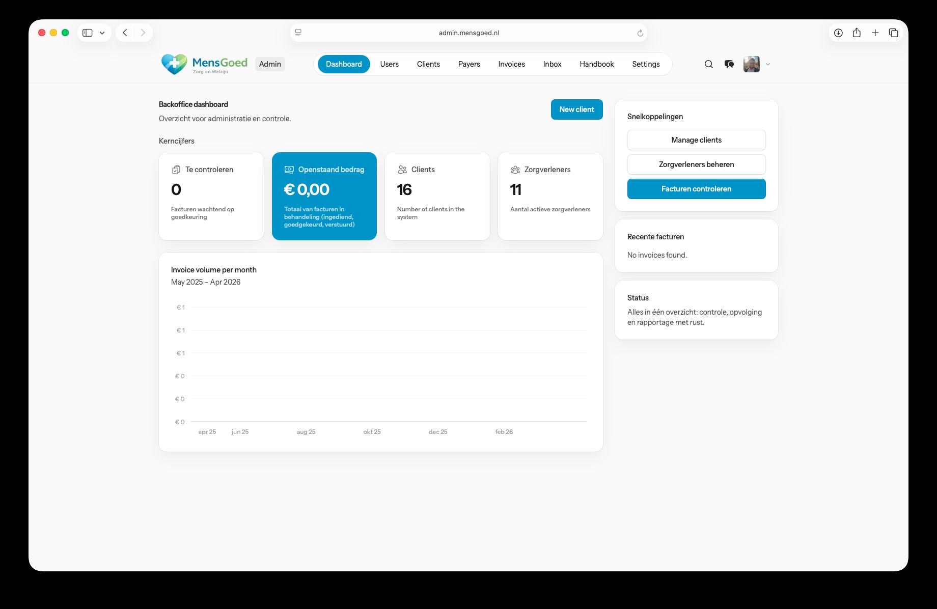 Laravel 12-webapp voor cliëntdossiers, jaarbudgetten, factuurworkflow (upload → review → verzenden), providerportaal met rapportage en inbox, plus token-gebaseerde factuurbatches voor betalers. Livewire + Flux UI, Nederlands/Engels.